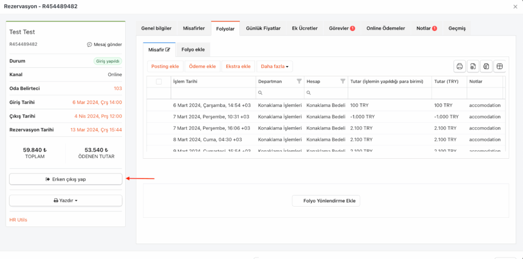 Erken çıkış yapılacak ilgili rezervasyonun folyolar ekranını açıp ekranın alt tarafında görülen yekün tutarında misafirden alınan ödeme yöntemine uygun olarak ödeme girin.