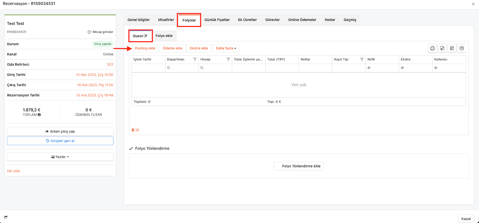 Bu hesaplar, rezervasyon folyo ekranında Posting Ekle butonuyla misafir hesabına eklenebilir.