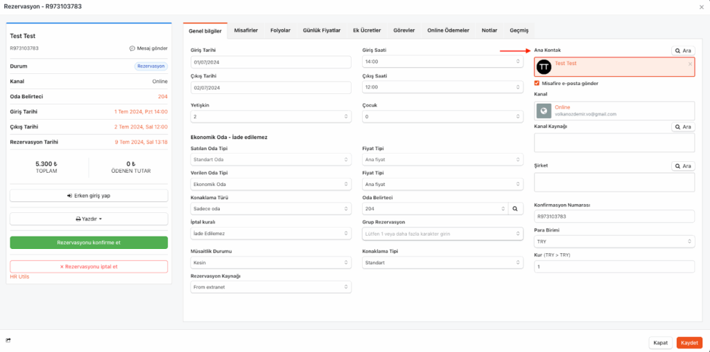 - Rezervasyon ekranındaki Kaydet butonuyla Ana Kontak değişimi işlemini tamamlayın.