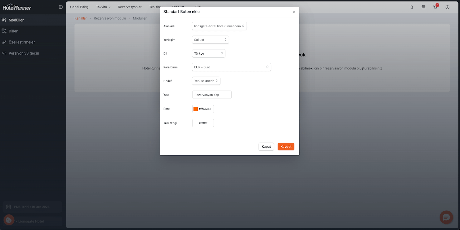 Alan Adı: Butonun hangi web sitesinde görüneceğini belirler. Eğer web sitesi HotelRunner üzerinden kullanılmıyorsa, doğru alan adı seçilerek yönlendirme sağlanır.