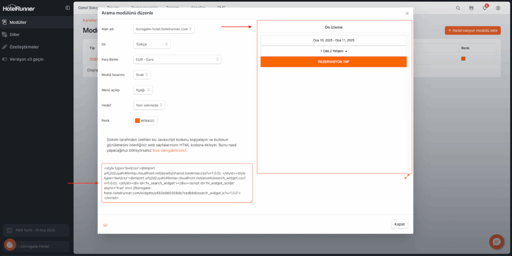Eğer otel, web sitesini HotelRunner üzerinden yönetmiyorsa, ekranın sol kısmında bulunan HTML script kullanılır. Bu script, otelin kendi web sitesi üzerinden rezervasyon almasını sağlamak amacıyla bir entegrasyon aracı olarak işlev görür ve otel web yöneticisi ile paylaşılır. Bu, otelin rezervasyon sürecini kendi web sitesine entegre etmesine olanak tanır.