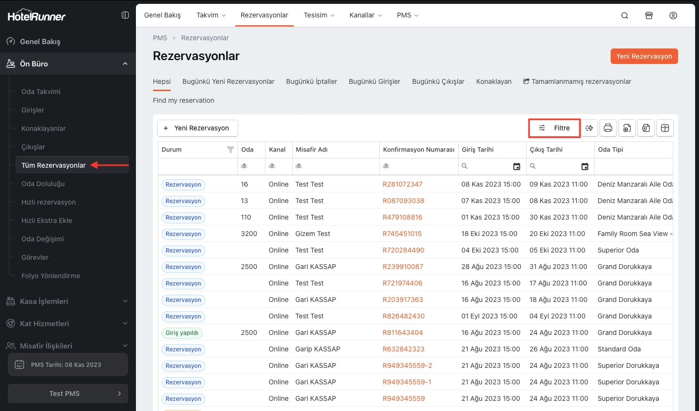 HotelRunner Rezervasyonlar sayfasında yer alan rezervasyonlarınızı filtreleyerek, seçmiş olduğunuz tarih aralığı, kanal, durum vb özelliklere göre rezervasyonlarınızı kontrol edebilir, bu filtrelenmiş bilgileri Excel’e aktarabilirsiniz.