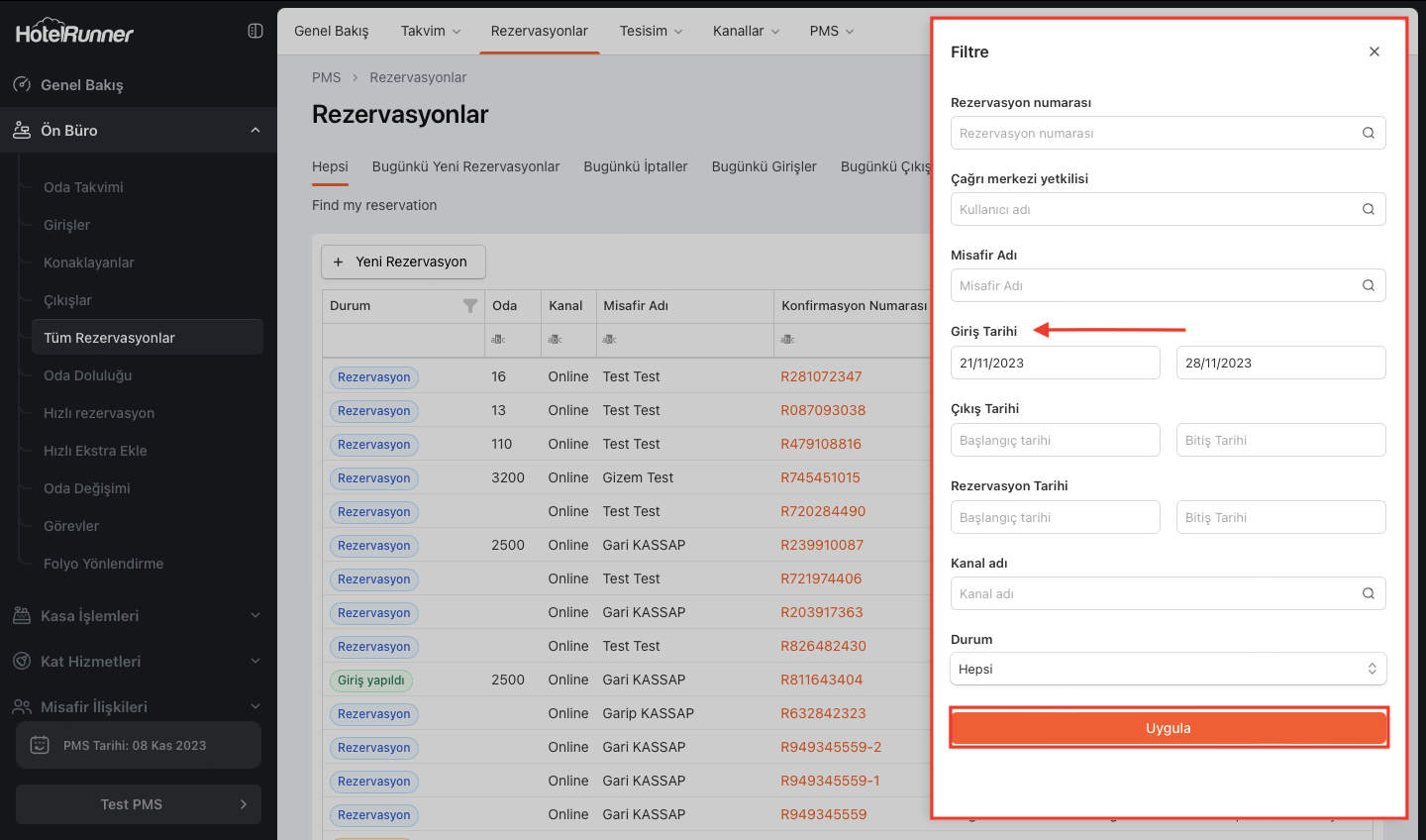 - Örnek: Belirli tarihler arasında bulunan tüm girişleri (check-in) filtrelemek için Giriş tarihi başlığı altından; Başlangıç tarihi ve Bitiş tarihi alanına gerekli tarihleri seçerek filtre yapabilirsiniz.