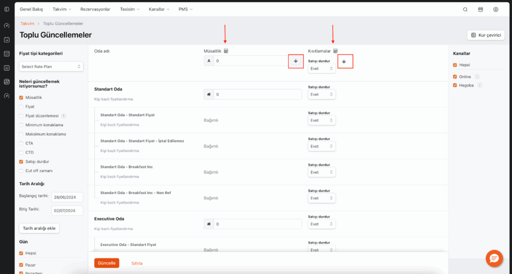 🔔 Not: Ön hatırlatma olarak, bu işlemi sırasında veri akışındaki olası hataları engellemek amacıyla, müsaitlik güncellemesini “0” olarak ayarlamanız gerekmektedir. Böylelikle odalarınızın satışını etkin bir şekilde durdurmuş olursunuz.