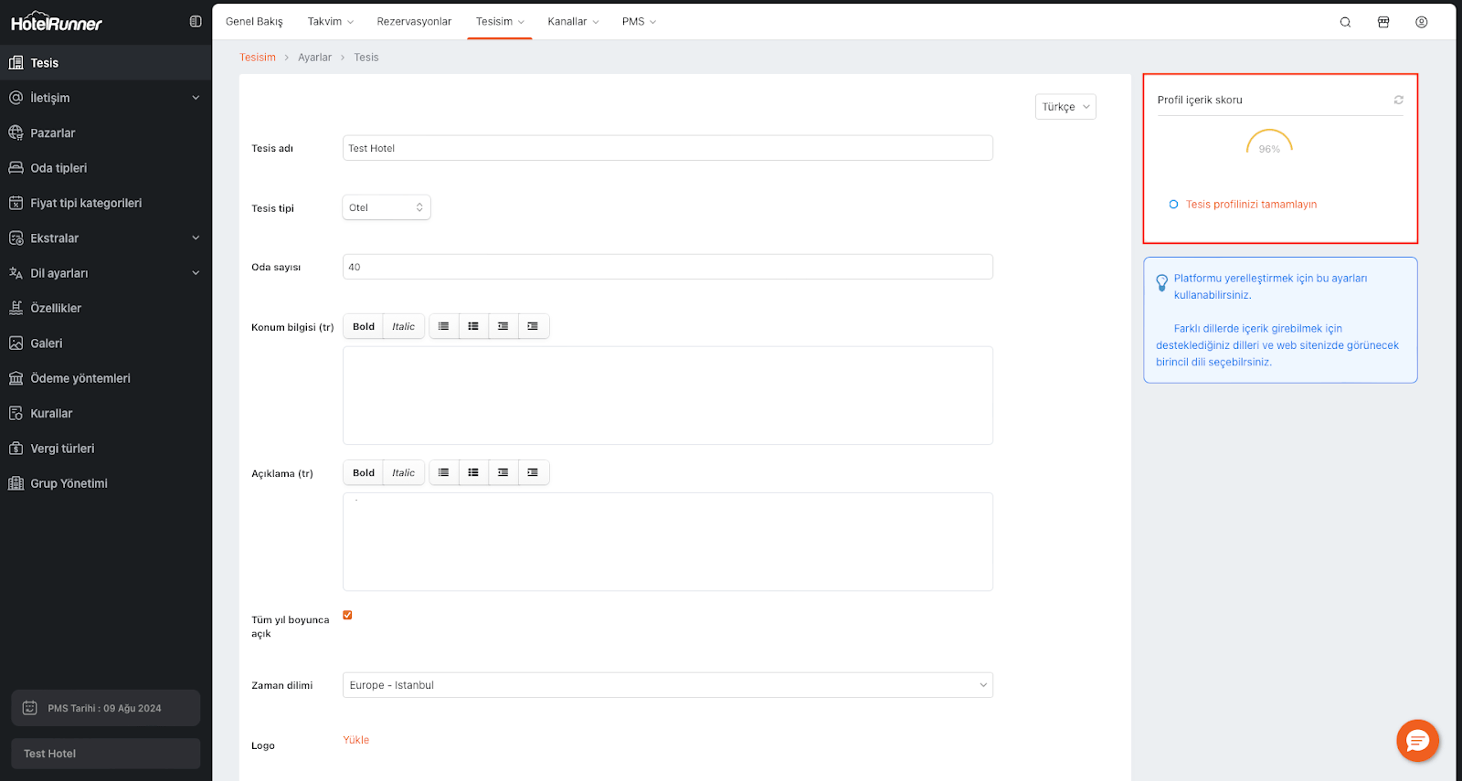 Tesis profil içerik skoru, işletmenize ait verilerin HotelRunner Kanal Yöneticisi’ne giriş durumunu ve bu verilerin gelişimini değerlendiren bir göstergedir. Bu skor, işletmenizin profilindeki bilgilerin eksiksiz, doğru ve güncel olup olmadığını belirlemek için kullanılır.