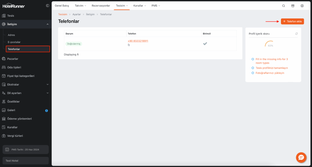 İletişim menüsünde yer alan Telefonlar bölümünden tesinize ait telefon numaralarını ekleyebilirsiniz. Tıpkı e-postalarda olduğu gibi, burada da dilediğiniz sayıda telefon numarası ekleyebilirsiniz, ancak eklenen numaralardan birincil telefon olarak sadece bir tanesi kullanılabilir.