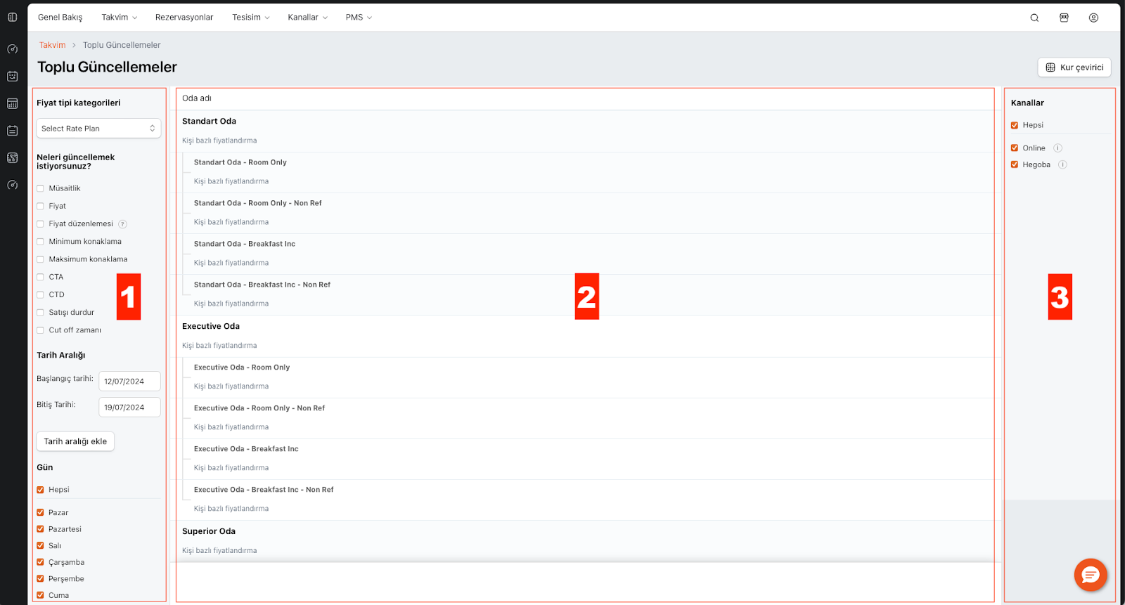 Toplu Güncellemeler Takvimi, birden fazla güncellemenin (fiyat, müsaitlik, kısıtlama vb.) eş zamanlı olarak yapılmasına olanak tanıyan güçlü bir araçtır. Kullanıcıların hem zaman kazanmasını sağlar hem de tüm kanalların senkronize bir şekilde yönetilmesini kolaylaştırır.