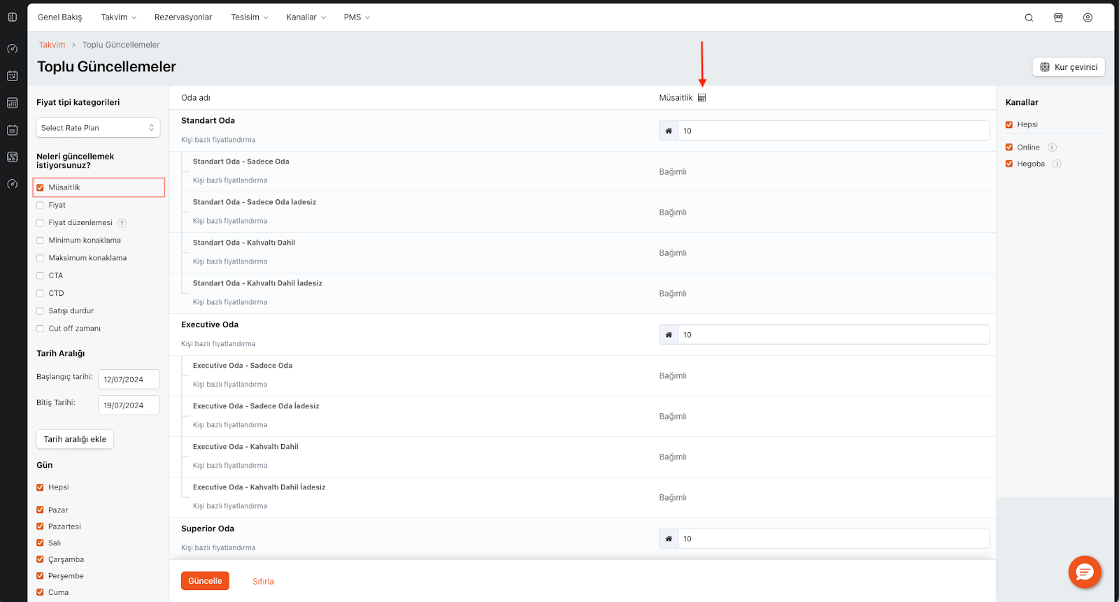 - Müsaitlik: Oda tipi karşısına satılabilir oda sayısını yazın.