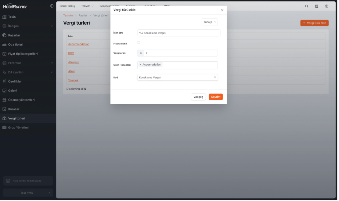 🔔 Ön Not: Burada oluşturulan vergiler yalnızca HotelRunner Kanal Yöneticisi ve PMS modüllerinde kullanılmaktadır. Bu vergiler, bağlı olunan satış kanallarına yansıtılmamaktadır.