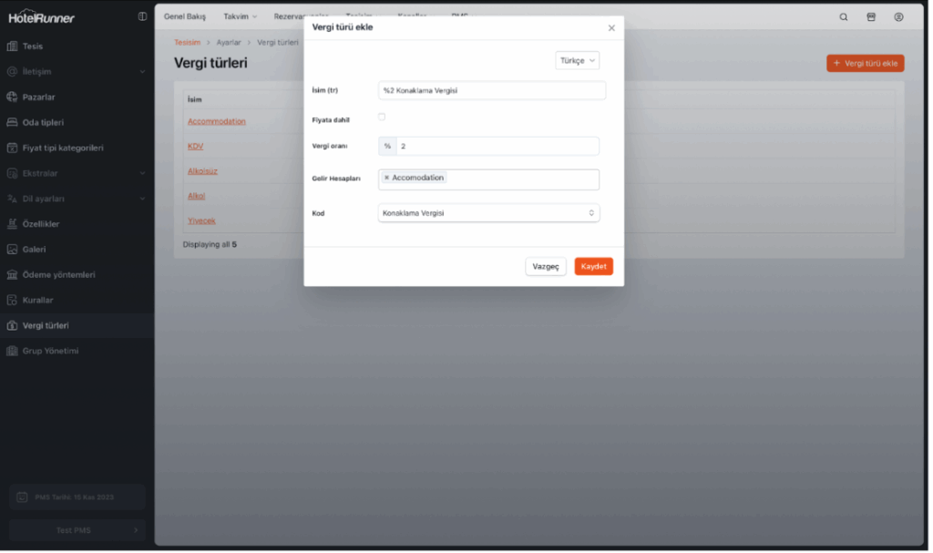 🔔 Ön Not: Burada oluşturulan vergiler yalnızca HotelRunner Kanal Yöneticisi ve PMS modüllerinde kullanılmaktadır. Bu vergiler, bağlı olunan satış kanallarına yansıtılmamaktadır.