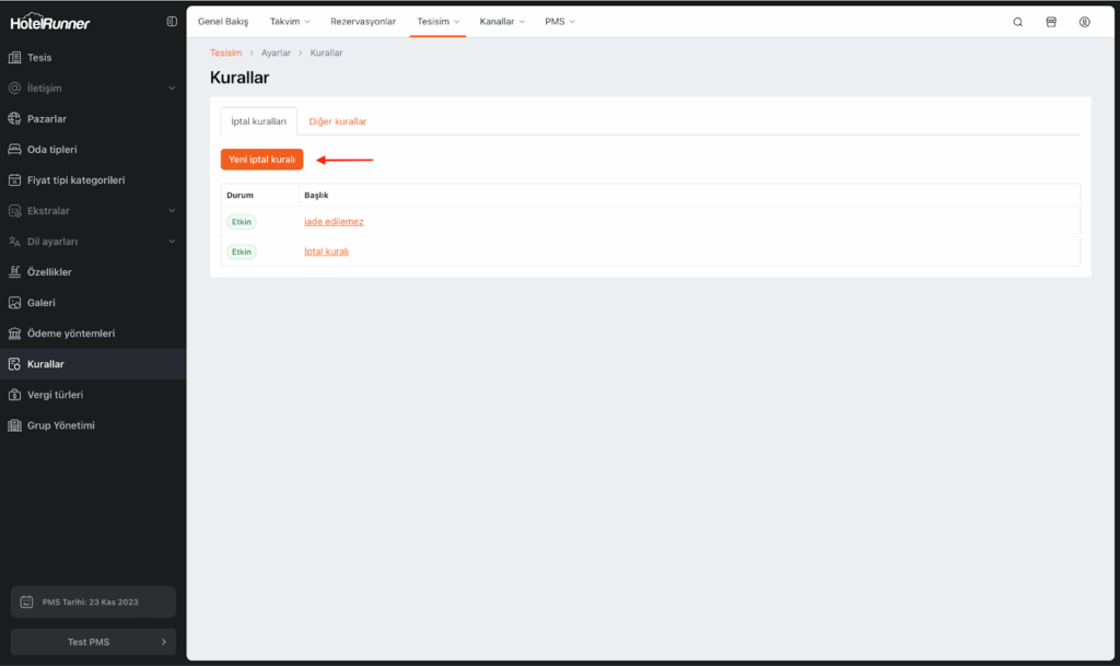 1. Tesisim > Ayarlar > Kurallar > İptal kuralları ekranını açın.